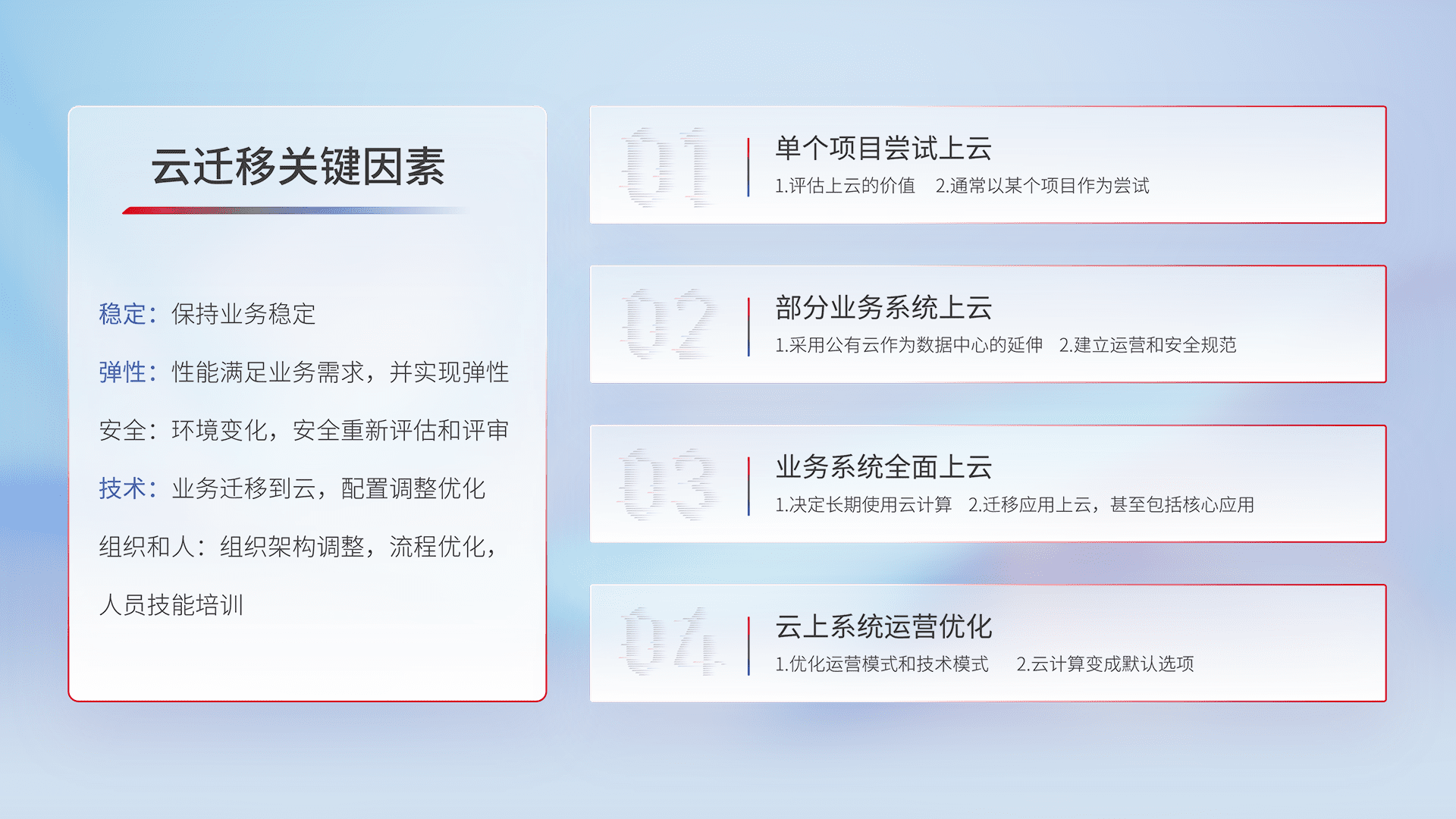 结合实际业务,,从规划设计、、云平台选型、、、云原生改造、、数据迁移、、、集成交付,,,,迁移全过程为客户识别最佳上云路径,,,,做好风险识别管理,,,设计网络架构、、、、身份权限、、安全审计合规、、、、操作审计、、日志审计、、监控告警策略、、、、多站点容灾设计等,,,对云上基础设施进行整体规划,,,提升IT治理水平,,以满足弹性、、高可用、、、高性能的需求。。