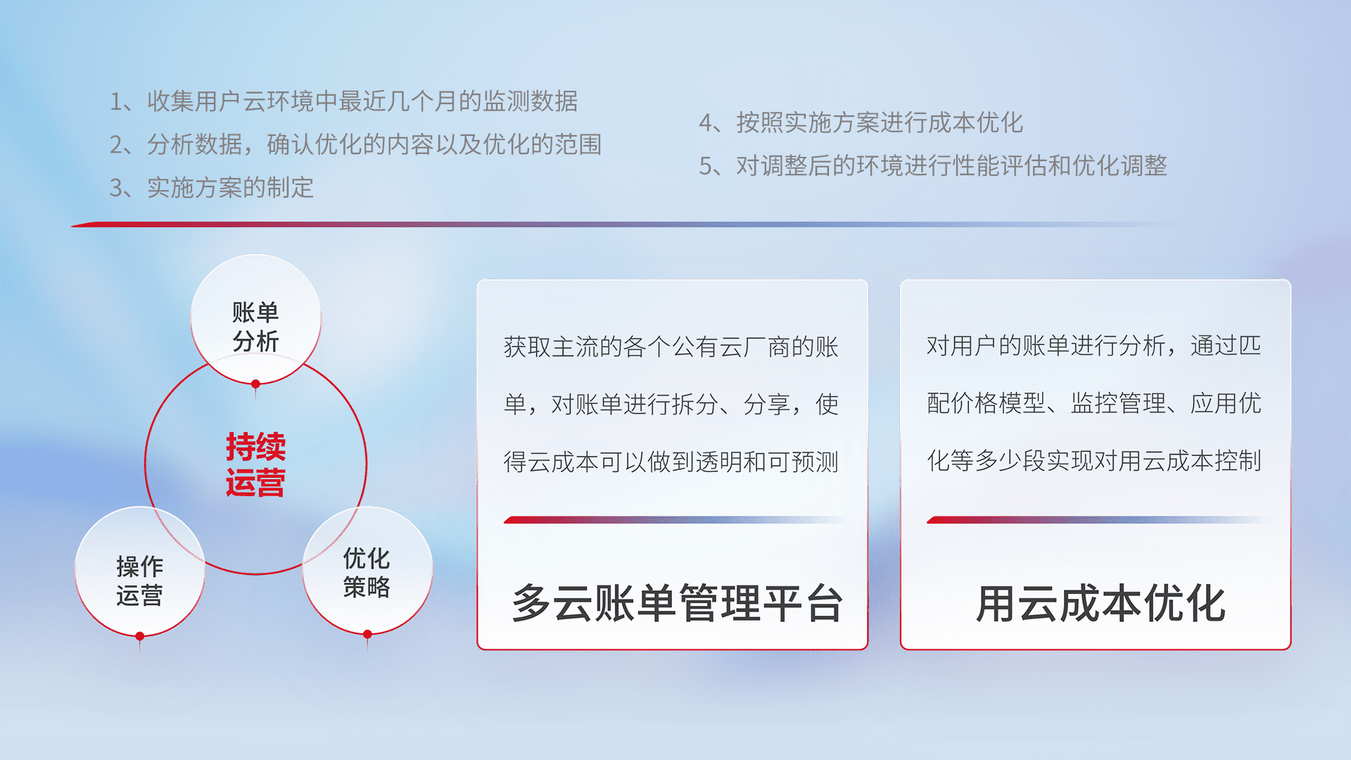 通过多云纳管,,,以统一的资源数据模型把客户的云资源进行抽象和封装,,,,进而实现对多云资源的统一操作,,,,保障云资源管理的可靠性、、、稳定性与可用性。。。量身定制化运维内容,,,配置、、开发运维、、、、补丁管理、、、备份、、、、监控、、、认证和访问管理、、审计和日常巡检等,,,,保障在用云过程中的可靠度,,,稳定度以及高可用率。。。。